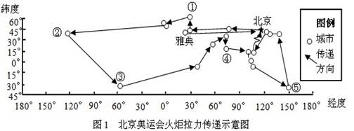 北京奥运会火炬将于2008年3月25日在雅典采集火种,4月1日从北京出发在全球传递,5月传回国内。读图1,完成1--3题。