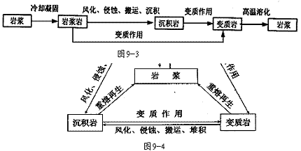 2.岩石与地壳物质循环:三大类岩石与岩浆之间的相互转化,构成了地壳物质的循环运动。
