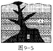 (2)沉积岩:岩石在外力作用下,经过风化、侵蚀、搬运、沉积和固积成岩作用形成,具有层理结构,一般含有化石。如石灰岩、页岩、砂岩、砾岩等,以及煤、石油、天然气等化石燃料。正常情况下,沉积岩层呈上新下老的关系,亦可根据所含化石确定时间先后顺序。物质构成和化石还可以反映当时的沉积环境,如煤层说明以前是湿润的森林,石灰岩层说明以前是温暖的浅海环境,等等。