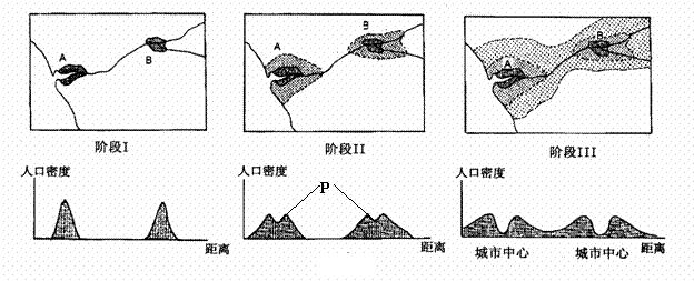(3)阶段III,城市中心人口密度进一步下降,若该地区人口出现“钟摆式”移动现象,则该地区的功能区最有可能是 ,该阶段AB城市之间城市用地连成一片,形成 。