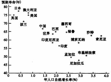 (1)据图说明一般情况下,人口自然增长率与预期寿命之间的关系。