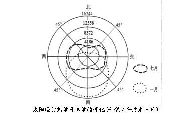 根据某地区多年对各朝向建筑墙面上接受太阳辐射热量的实测值,计算出最冷月(一月)和最热月(七月)日总量,并绘出太阳辐射热量日总量变化图,读图判断16-18题:
