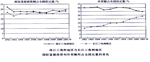 读下图“珠江三三角洲与长江三角洲地区国际直接投资和外贸额所占全国比重的变化图”,回答23-24题: