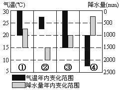 6、图2所示的几种气温和降水量年内变化范围中,与甲地相符的是