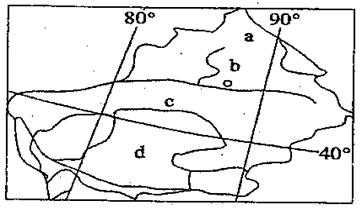 当上面右图中a处的上升流最强烈时,下列四幅图中能反映北印度洋地区季节的是( )![]()