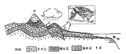 (3).乙地与丙地均有地下水(泉)出露,按照埋藏条件,乙地为 水,丙地为 水;两地相比,水质较好、流量较稳定的是 地。