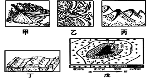(2).丁图所示地质构造为 ,戊图所示地质构造为 。