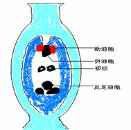 受精卵分裂一次,形成两个细胞,接近珠孔的基细胞与顶细胞。顶细胞经过三次分裂,形成八个细胞。这八个细胞分成两层,这时就形成了球状胚体。基细胞经过几次分裂,形成胚柄。球状胚体进一步发育形成子叶、胚芽、胚轴和胚根--胚。