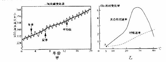 43.(5分)甲图表示某地20年间大气CO2浓度的变化,乙图表示温度对该地某种植物光合作用和呼吸作用的影响。