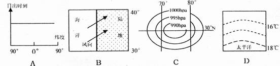 当上面右图中a处的上升流最强烈时,下列四幅图中能反映北印度洋地区季节的是( )![]()
