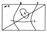 读北半球某陆地局部图,图中X,Y为等高线(等高距为100米),L为河流,对角线为经线。据此回答5-6题。