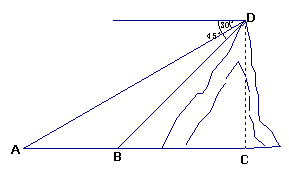 (12分)如图,我边防战士在海拔高度(即CD的长)为50米的小岛顶部D执行任务,上午8时发现在海面上的A处有一艘船,此时测得该船的俯角为30°,该船沿着AC方向航行一段时间后到达B处,此时测得该船的俯角为45°.求该船在这段时间内的航程(计算结果保留根号).