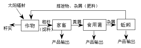 C.当蚯蚓利用食用菌杂屑并将其同化为自身的有机物时,能量就从第三营养级流入第四营养级;由于食物链延长,能量逐级损耗,系统总能量利用效率降低![]()