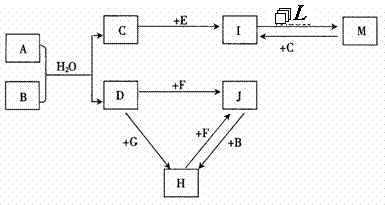 (16分)下列每一方框中的字母代表一种物质或其溶液,其中A为常见的气态氧化物,G为常见固态氧化物,B为液态非金属单质,化合物L为淡黄色粉末,E、F为常见金属单质,I和M两溶液反应后可生成白色胶状沉淀,各物质有如下转化关系:
