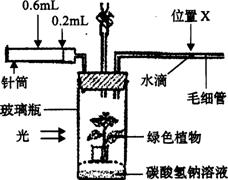 Ⅱ、右图是探究绿色植物光合作用速率的实验示意图,装置中的碳酸氢钠溶液可维持瓶内的二氧化碳浓度。该装置放在20℃环境中。实验开始时,针筒的读数是0.2mL,毛细管内的水滴在位置X。30分钟后,针筒的容量需要调至0.6mL的读数,才能使水滴仍维持在X的位置。据此实验回答下列问题:
