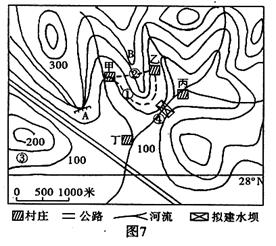 (4)如果在该地区建设小城镇,甲、乙、丙、丁四个村庄发展条件最有利的是 村,理由是 。(2分)