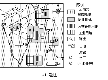 44.(11分)下图为“某城市用地示意图”,该城市A为主城区,兼有B、C、D、E各城区,图中右上角为风向标。读图回答下列问题。