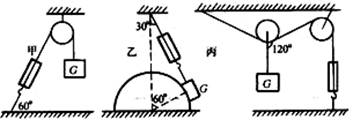 如图所示,弹簧秤、绳和滑轮的重力及摩擦力均可不计,物体重量都为G。在甲、乙、丙三种情况下,弹簧的读数分别是F1、F