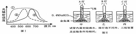 (10分)现有A、B、C三种灯泡,其发出光波的波长与光辐射强度的关系如下图I所示,现需从中选择一种灯泡用于温室中给植物补光,期望最大限度地增加光合作用的强度。为此某同学设计了图Ⅱ所示的实验装置。回答下列问题:(注:叶绿体中的色素主要吸收430-450nm的蓝紫光和640-660nm的红橙光。)