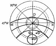 下图为地球某时刻太阳高度分布示意图,图中粗线为等太阳高度线。回答9-12题