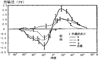下图为全球海洋和各大洋表面在南北方向上的热量输送(向北输送为正,向南输送为负)分布图。读图回答13-14题。