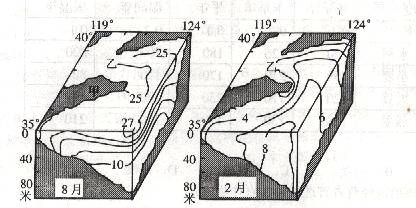 A.2月表层海水南北温差小于8月 B.2月与8月60米以下海水温度变化不大