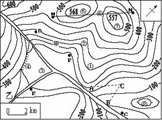 (2)、图中④处陡崖相对高度范围可能为 ,陡崖顶的海拔高度可能为 ⑧处的海拔高度范围可能为 。