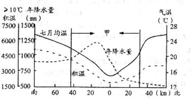 下面是以我国境内某地(图中0千米处)为中心沿108°E所作的气候统计图。据图判断6-8题.![]()
