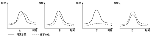9.四幅图中能正确反映河水位与地下水位关系的是: ![]()