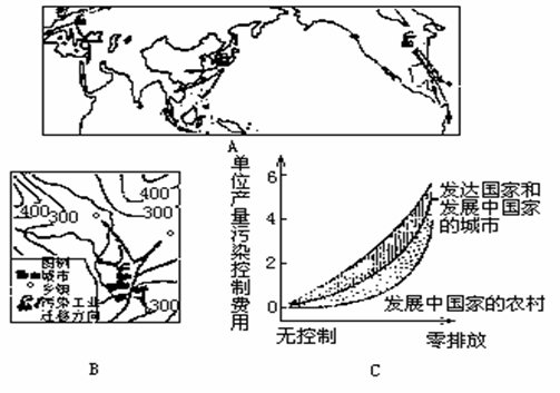 26. 读图下中的三幅图。图A和图B的箭头表示污染工业发生的地理转移的趋向,图C表示单位面积产品的污染控制费用与污染物排放量的关系。回答: