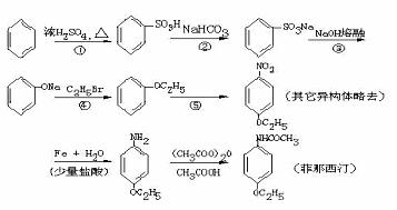 反应②中生成的无机物的化学式是 ,反应③中生成的无机物的化学式是 ,反应⑤的化学方程式是 ;菲那西汀水解的化学方程式是 。