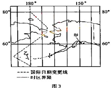 据报道,哈尔滨地区2004年10月14日出现的日偏食开始于9时20分,结束于10时57分。当哈尔滨日食结束时,美国阿拉斯加州某地为13日16时57分。那里人们看到的日偏食开始于13日17时55分,结束与13日18时46分。读图3,完成下题。