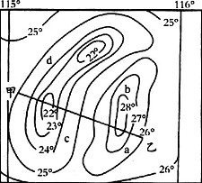 下图为某大陆沿海地区7月份等温线图,读图回答18-20题。