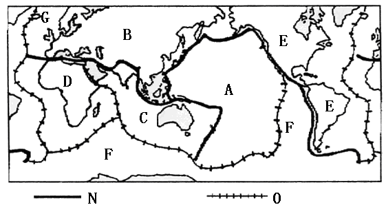 (2)图例N代表 边界,O代表 边界,地球上的六大板块以N和O为界。(2分)