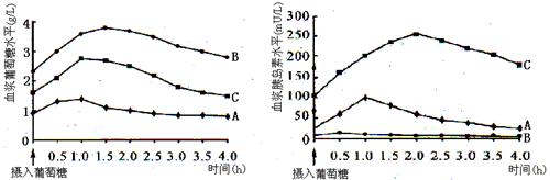 17.正常人的血糖含量是0.8-1.2g/L,含量过高将导致糖尿病(分为Ⅰ型和Ⅱ型两类)。注射胰岛素可以治疗Ⅰ型糖尿病,对Ⅱ型则无效。为进行一次医学测试,A、B和C三名成年人禁食12h,然后喝下含100g葡萄糖的溶液。在摄入葡萄糖后的4h内,定时测定各人血浆中的葡萄糖和胰岛素水平,结果如图所示。据此分析正确的是