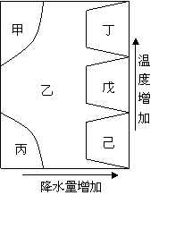 右图是“植被类型与温度、降水量的关系示意图”,图中植被类型分别为草原、苔原、荒漠、阔叶林、针叶林、热带雨林。读图完成16-17题