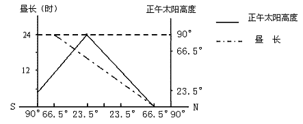读沿45°E经线各地某时刻正午太阳高度和昼长分布图,