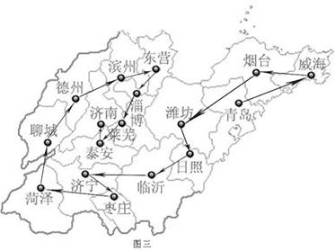 第十一届全国运动会于2009年10月11日在山东济南开幕。以“祝福祖国,共享全运”为主题的十一运会火炬传递活动,将于9月19日至27日、10月8日至15日在我省17个城市进行。结合下列火炬传递路线图(图三),回答20题