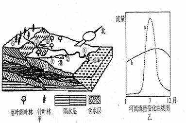 A.图乙中b曲线反映了图乙中①处水文站的流量变化
