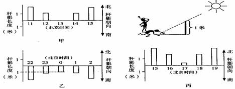 有三地同学设计一个“影子长度”的探究学习活动,他们在当地时间10:00-14:00每隔一小时测量一根1米长的杆的影子长度,所得数据制成图表。图9为6月22日三个地区同学所提供的观测成果。根据资料回答22-23题。