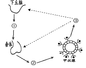 24.(9分)右下图表示下丘脑、垂体、甲状腺及它们分泌的激素之间的关系,其中①②③表示相关腺体分泌的激素, 请回答下列问题。