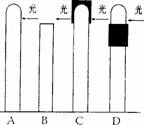 (4分)如图表示进行燕麦胚芽鞘向光性实验的示意图。现将种植在同一条件下,同一时期的燕麦幼苗分别进行如下处理:A处于自然条件下;B切去胚芽鞘尖端;C在胚芽稍尖端上罩上黑纸罩;D在胚芽稍尖端以下套上黑纸筒。然后从暗处取出一起放至窗台,使光线从单侧照射,试分析四种幼苗的生长情况: