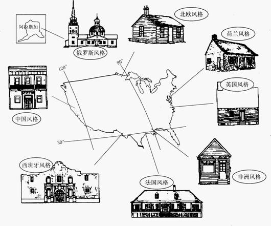 (1) 中国和俄罗斯风格建筑主要位于美国