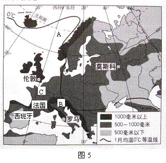 (1)描述图5中一月均温0°C等温线的走向,并说明甲地等温线向北凸出的主要原因。(3分)