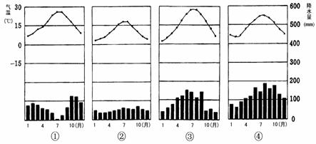 (3)下面的4幅气候资料图中,与乙地的气候特征相符的是图 。这表明乙地的气候特征与甲丙相比有细微的差别,表现在 __________________________________________。(4分)