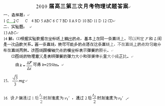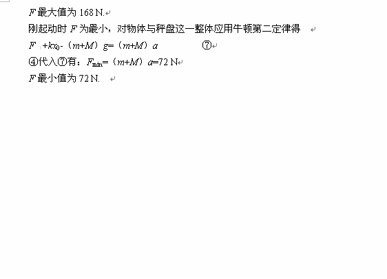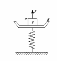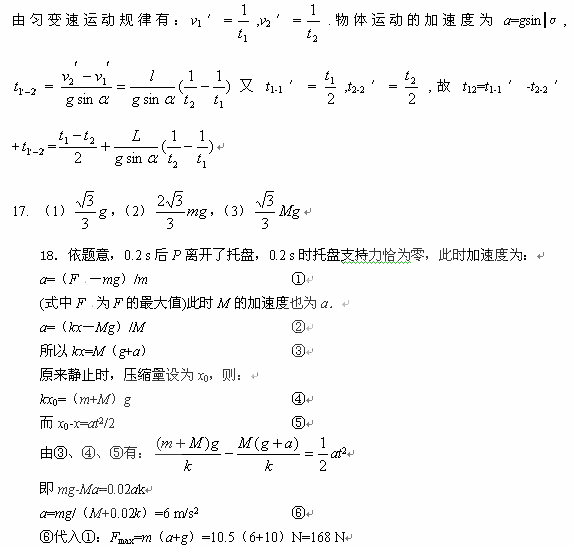 18.(10分)一弹簧秤的秤盘质量M=1.5 kg,盘内放一物体P,物体P的质量m=10.5 kg,弹簧质量不计,其劲度系数为k=800N/m,系统处于静止状态,如图所示.现给P施加一个竖直向上的力F,使P从静止开始向上做匀加速运动,已知在头0.2 s内F是变力,在0.2 s以后是恒力.求F的最小值和最大值各是多少?(g=10 m/s2)