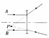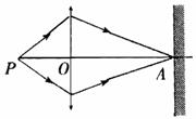 如图所示,在凸透镜主光轴上放一点光源P成像于A点,OP<OA,A处有垂直于主轴的平面镜,通过透镜的光经平面镜反射后[ ]