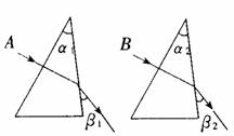 如图所示,是两个同种玻璃制成的棱镜,顶角α1略大于α2,两束单色光A和B分别垂直入射于三棱镜后,出射光线与第二界面的夹角β1=β2,则[