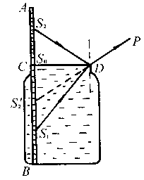 在广口瓶中盛满水,如图那样把直尺AB紧挨着广口瓶瓶口的C点竖直插入瓶内,这时,在直尺对面的P点观察水面,能同时看到直尺在水中的部分和露出水面的部分在水中的像,读出你看到的直尺水下部分最低点的刻度S1以及跟这个刻度相重合的水上部分的刻度S2的像S2′,量出广口瓶的瓶口内径d,就能算出水的折射率。这是为什么?请列出计算折射率的公式。
