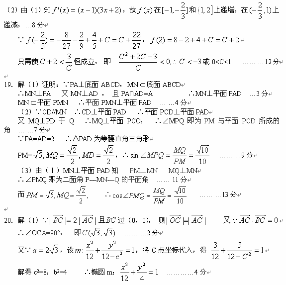 19.(本小题满分13分)已知四棱锥P-ABCD(如图),底面是边长为2的正方形,侧棱PA⊥底面ABCD,M、N分别为AD、BC的中点,MQ⊥PD于Q.